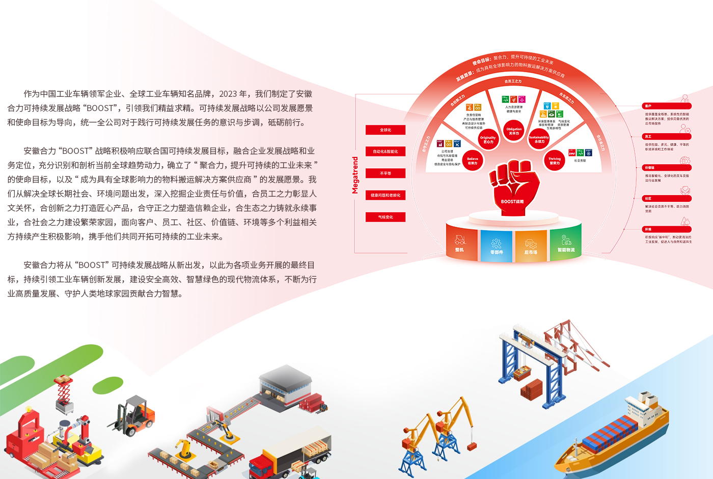 合力叉車將秉持“世界一流 百年合力”的企業愿景,以“變革、創新、開放、合作”為動力,致力于成為全球叉車專家及中國自動化物流設備供應商。
